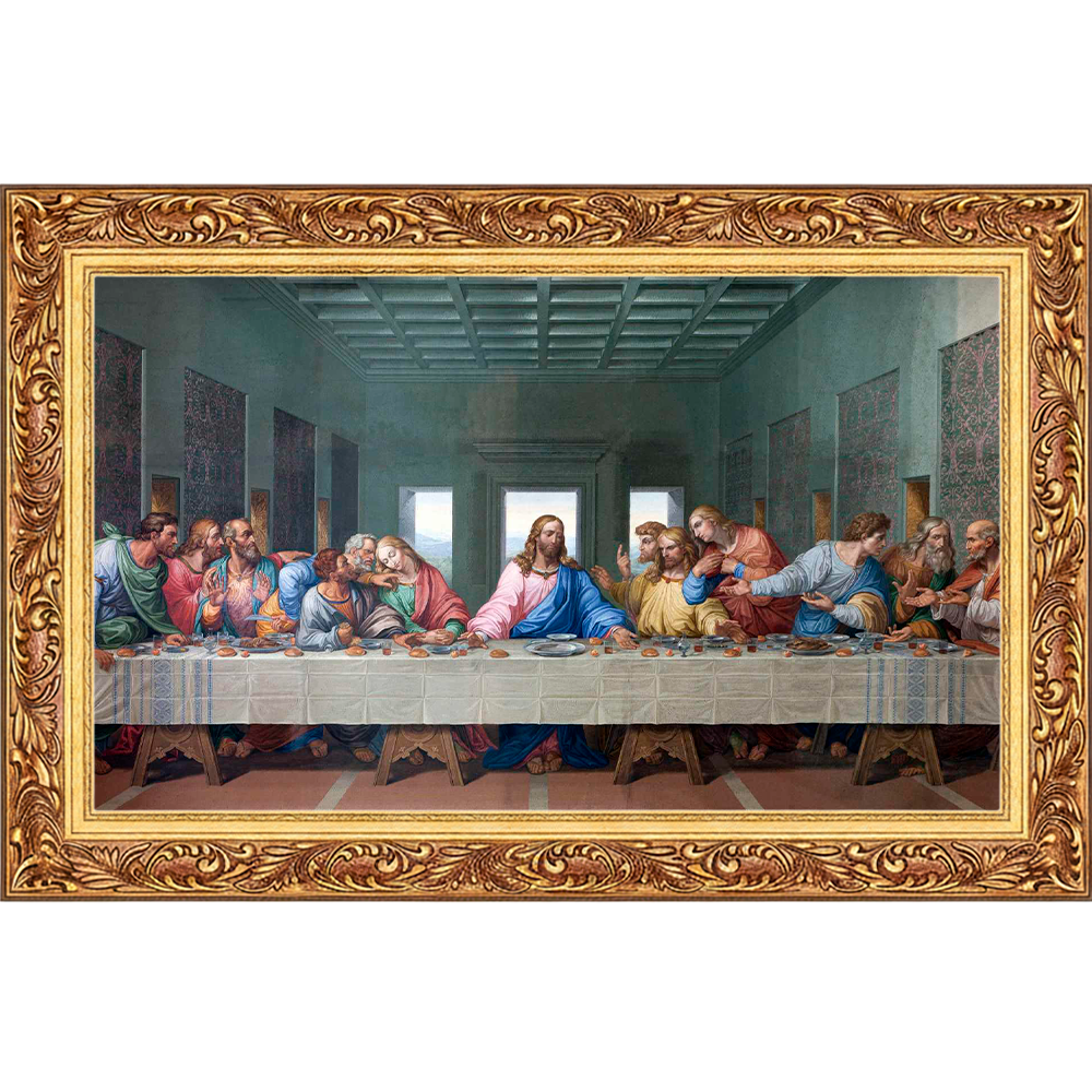 A obra representa a Última Ceia, momento bíblico em que Jesus Cristo compartilha sua última refeição com os doze apóstolos.