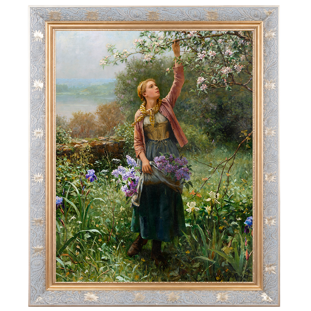 Nesta pintura luminosa e delicada, Daniel Ridgway Knight retrata uma jovem camponesa em meio a um jardim florido, estendendo o braço para alcançar os ramos de uma árvore em flor. A cena é envolta por uma atmosfera primaveril, marcada pela abundância de cores suaves, luz natural e vegetação exuberante.