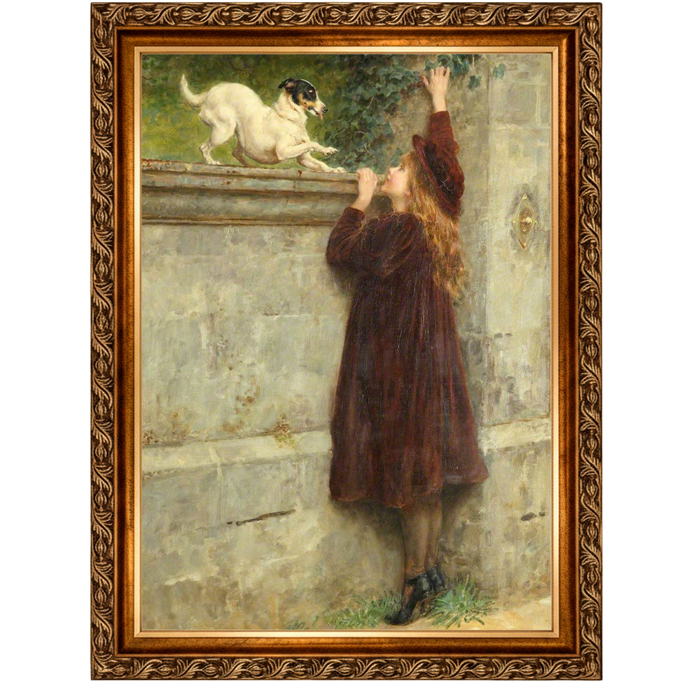 A obra retrata uma menina e um cachorro posicionados sobre um muro de pedra, compartilhando um momento de brincadeira e cumplicidade. A criança se inclina levemente em direção ao animal, enquanto o cão se apoia de forma confiante, sugerindo uma interação espontânea e afetuosa. A cena captura um instante simples do cotidiano, marcado pela proximidade e pela confiança mútua.