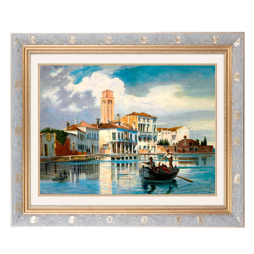 A pequena embarcação anima a cena, sugerindo o cotidiano local e a atividade constante das águas venezianas. As figuras humanas, discretas e em escala reduzida, contribuem para a sensação de vida sem desviar a atenção da paisagem.