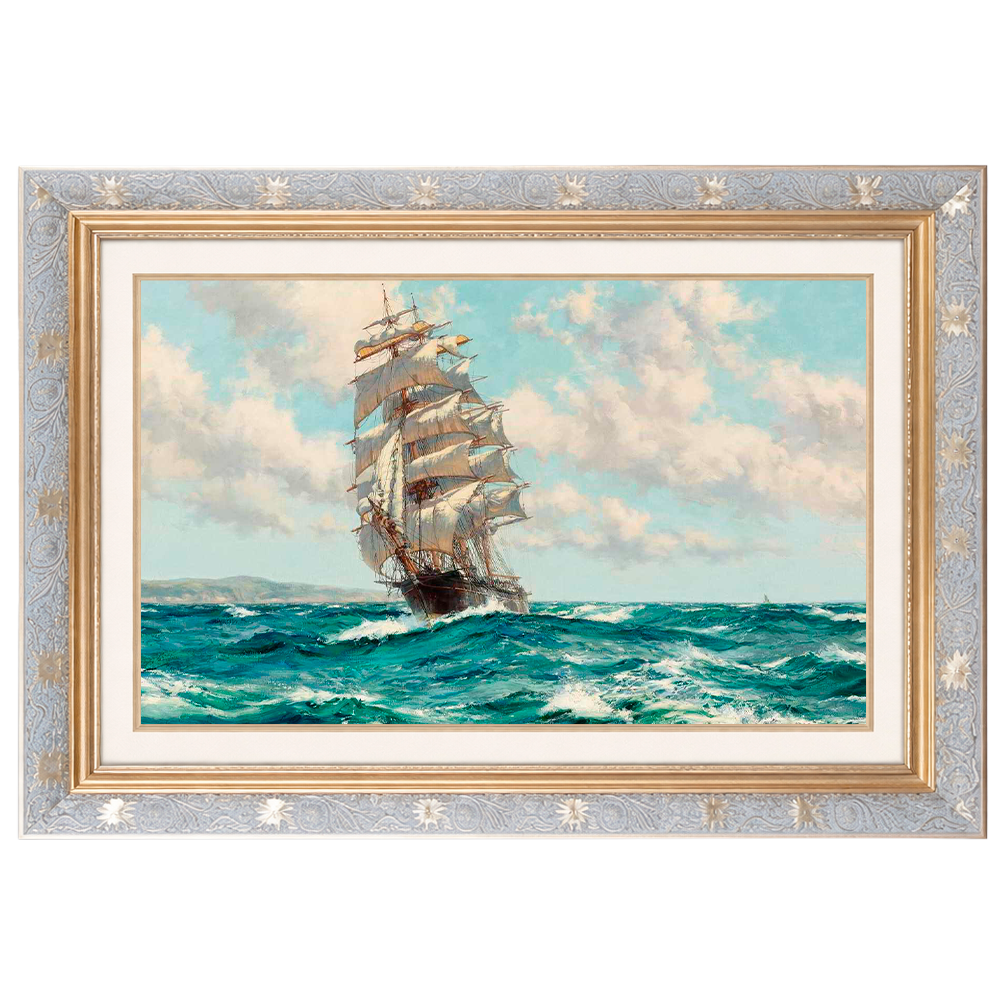 O navio é o elemento central da composição, pintado com grande atenção aos detalhes, enquanto o mar e o céu criam uma atmosfera dinâmica e profunda.